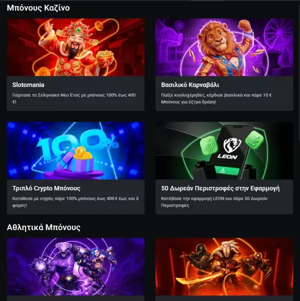 Πέρα από το μπόνους καλωσορίσματος, το LeonCasino τρέχει στοχευμένες προσφορές καζίνο που ταιριάζουν σε διαφορετικά στυλ παιχνιδιού και προτιμήσεις. Είτε προτιμάς την ευελιξία των crypto, προνόμια αποκλειστικά για mobile, είτε εποχιακά events, ανανεώνουμε συνεχώς τις προσφορές μας ώστε να υπάρχει πάντα επιπλέον αξία που σε περιμένει στην επόμενη συνεδρία σου.