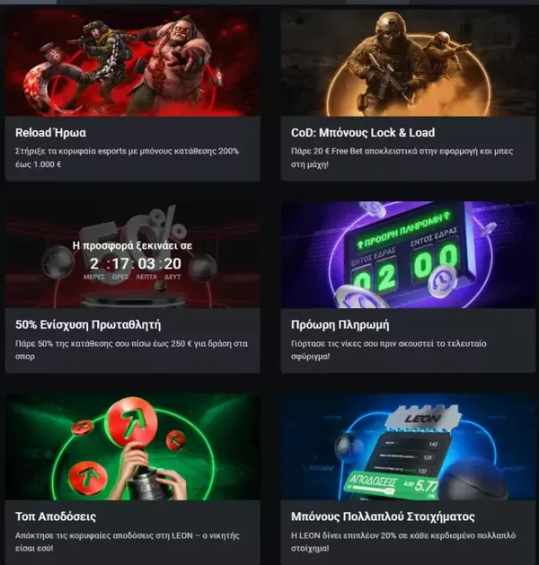 Χρησιμοποιούμε κωδικούς προσφοράς για να ξεκλειδώνουμε αποκλειστικές καμπάνιες ή να ενισχύουμε τις ενεργές προσφορές σου. Μπορείς να βρεις έναν έγκυρο κωδικό προσφοράς Leon στα newsletters μας, στις ειδοποιήσεις της εφαρμογής ή στα επίσημα κανάλια social media. Για να τον ενεργοποιήσεις, απλώς εισήγαγε τον κωδικό στη σελίδα μπόνους πριν τοποθετήσεις τα επιλέξιμα στοιχήματά σου.