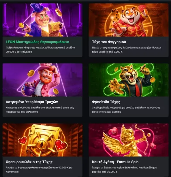 Το Casino Leon φιλοξενεί τακτικά τουρνουά που συνδυάζουν παιχνίδι σε φρουτάκια με ανταγωνιστικούς πίνακες κατάταξης και σημαντικά prize pools.