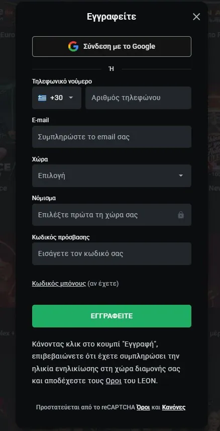 Σχεδιάσαμε την Leon εγγραφή ώστε να συλλέγει μόνο ό,τι χρειαζόμαστε για να ανοίξουμε τον λογαριασμό σας, να εφαρμόσουμε σωστά όρια και να σας προετοιμάσουμε για καταθέσεις και αναλήψεις. Κατά την εγγραφή, θα εισαγάγετε βασικά προσωπικά στοιχεία ώστε να επιβεβαιώσουμε ηλικία και ταυτότητα. Παρακαλούμε χρησιμοποιήστε πραγματικά στοιχεία, γιατί αργότερα πρέπει να ταιριάζουν με τα έγγραφα επαλήθευσης.